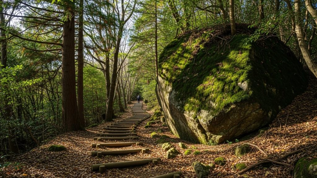御船石は花崗岩でできた巨石で、「祭神である大碓命が乗ってきた船が石になった」という言い伝えがあります。登山道沿いにあり、その大きさと存在感は見る者を圧倒します。