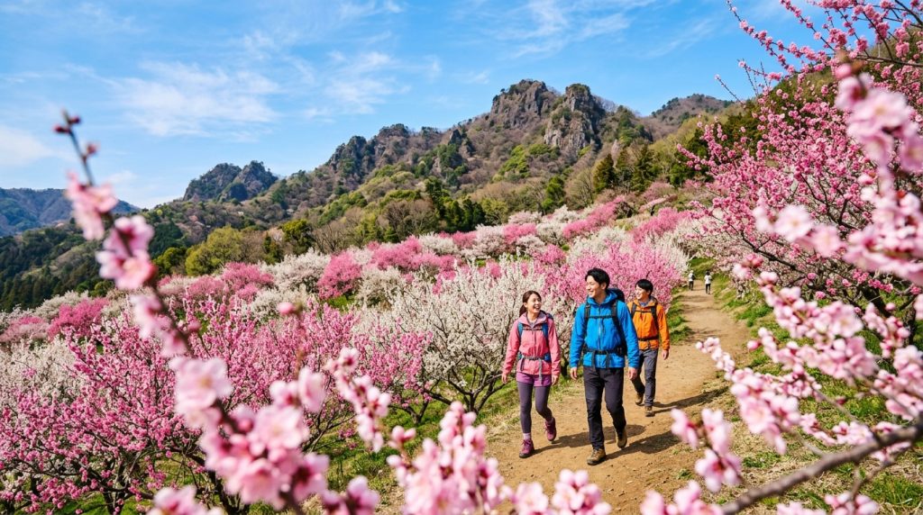 幕山は梅のシーズンだけでなく、四季を通じて楽しめる山でもあります。幕山公園内には梅以外にもシャクナゲ、紫陽花、金木犀など四季折々の花が咲いています。春は梅と桜、初夏は新緑と紫陽花、秋は紅葉と金木犀、冬は澄んだ空気の中での展望と、どの季節に訪れても異なる表情を見せてくれます。ただし、最も人気が高く幕山らしさを味わえるのは、やはり梅の花が咲く2月から3月の早春の時期です。