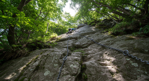 山頂までのルートは男山(1830m)から女山(1897m)の2つのピークを越える周回コースで、全体で約2時間という手頃な時間で完歩できます。登山道は石畳や砂利道で整備されており、急な箇所には階段やロープが設置されているため、特に危険な場所はありません。天候の良い日であれば、スニーカーと軽装での登山も可能です。