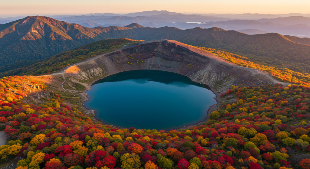 そして、山頂の最大のハイライトが山頂直下の火口に静かにたたずむ魔女の瞳との対面です。山頂の北側の縁から眼下を覗き込むと、完璧な円形をしたコバルトブルーの火口湖が目に飛び込んできます。その色彩の鮮やかさ、形の美しさ、そして火山の荒々しい岩肌とのコントラストは、言葉では表現しきれないほどの感動をもたらしてくれます。特に秋には、火口の周辺が紅葉に彩られ、青と赤の色彩が織りなす絶景は一生の思い出となるでしょう。