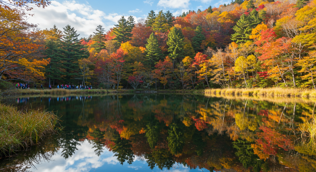 10月中旬から11月上旬にかけて、紅葉は麓の温泉郷や渓谷へと下りてきます。いもり池は標高約750メートルに位置し、この時期にブナ、ヤマモミジ、シラカバなどが池の周りを鮮やかに彩ります。秋色に染まった妙高山を映す「逆さ妙高」は、この季節ならではの特別な風景であり、多くの写真愛好家がこの瞬間を求めて訪れます。