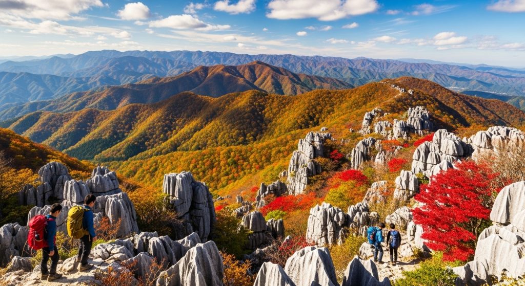 滋賀県と岐阜県の県境に雄大にそびえる霊仙山は、標高1,094メートルの鈴鹿山脈北端に位置する名峰です。霊仙山の登山では、日本でも珍しいカルスト地形が織りなす独特の景観を楽しむことができ、特に秋の紅葉シーズンには山肌を覆う広葉樹林が燃えるような色彩に染まり、多くの登山愛好家を魅了しています。滋賀県側からのアクセスが便利なこの山は、山頂部に広がる石灰岩のカレンフェルトやドリーネといった特異な地形が特徴的で、まるで異世界に迷い込んだかのような非日常的な体験を味わえます。霊仙山は春のフクジュソウやセツブンソウで『花の百名山』にも選定されていますが、秋の紅葉登山もまた格別の魅力があります。カルスト地形特有のなだらかな山頂台地からは、琵琶湖や伊吹山、遠くは白山や北アルプスまでを一望でき、その展望の良さと紅葉の美しさが見事に調和します。この記事では、霊仙山の登山ルート、紅葉の見頃、カルスト地形の神秘、そして安全な登山のための情報を詳しくご紹介します。